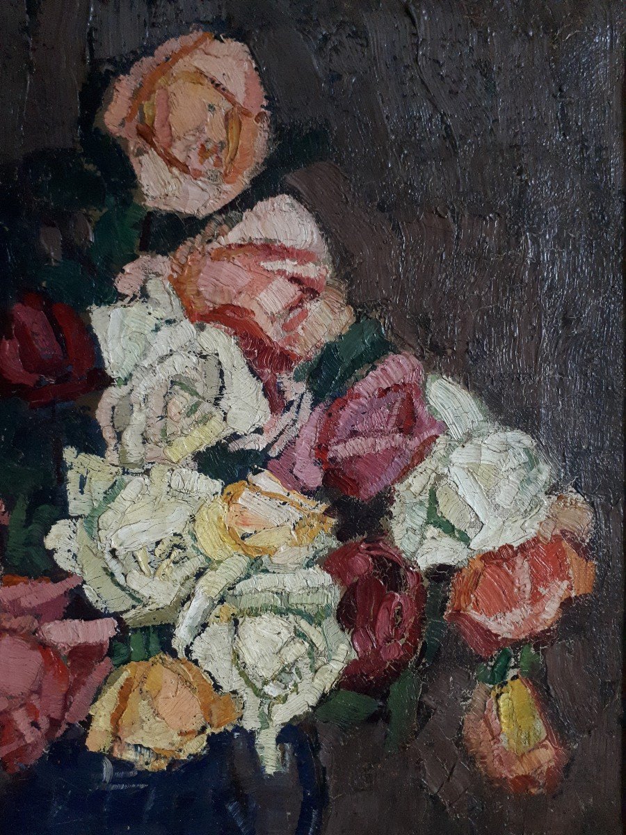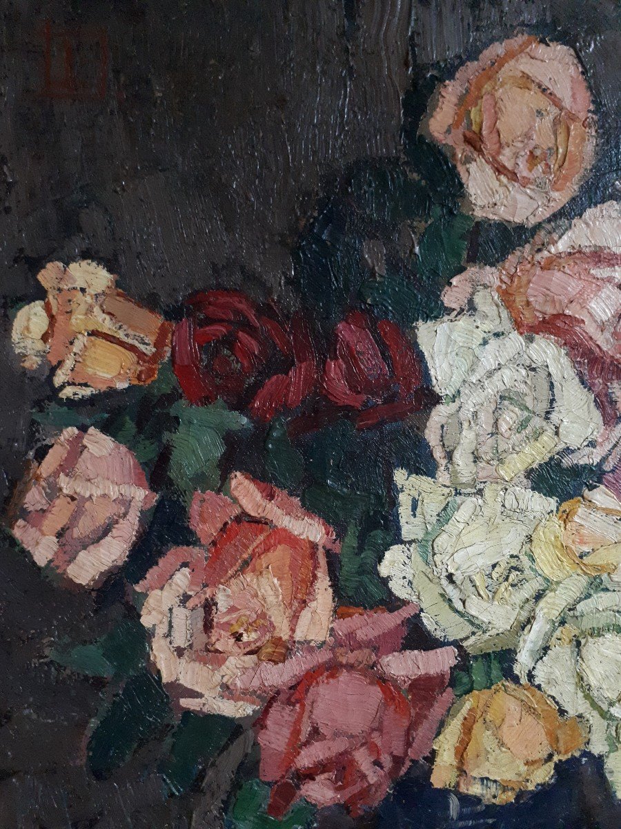 The composition reveals confident, intentional brushwork that prioritizes expression over realism. It also achieves a rare balance between structured form and emotional expression. Soft pinks, deep reds, creamy whites, and buttery yellows create a vibrant palette that contrasts with the navy blue vase and dramatic background. Darriet's training under masters Louis-Alexandre Cabié and Félix Carme is evident, yet this work demonstrates her distinctive artistic vision that transcends traditional floral painting conventions.