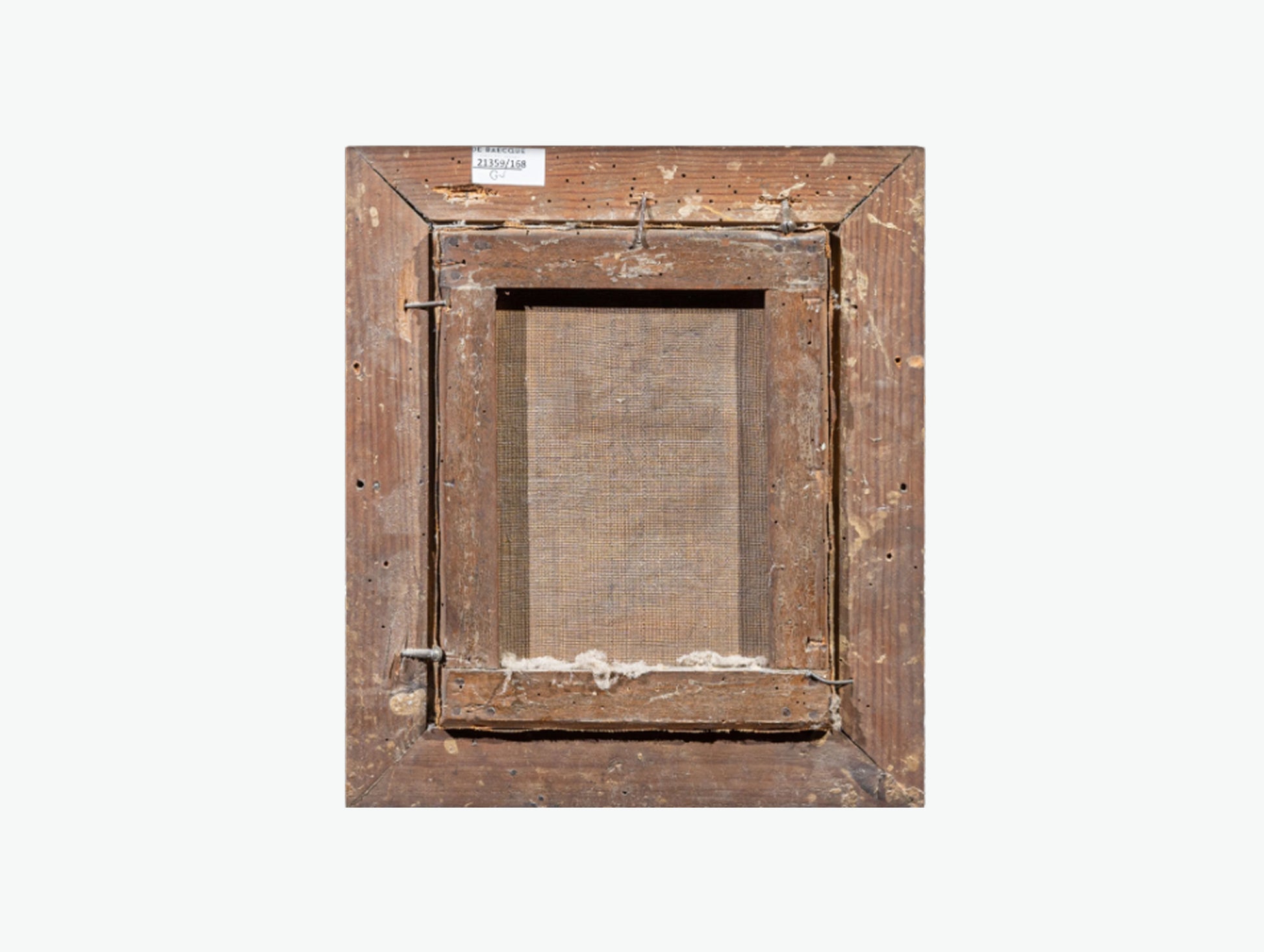The painting bears the grace of time: a soft craquelure across the surface and a warm patina on the original carved and gilded frame, now mellowed by nearly two centuries of life.
