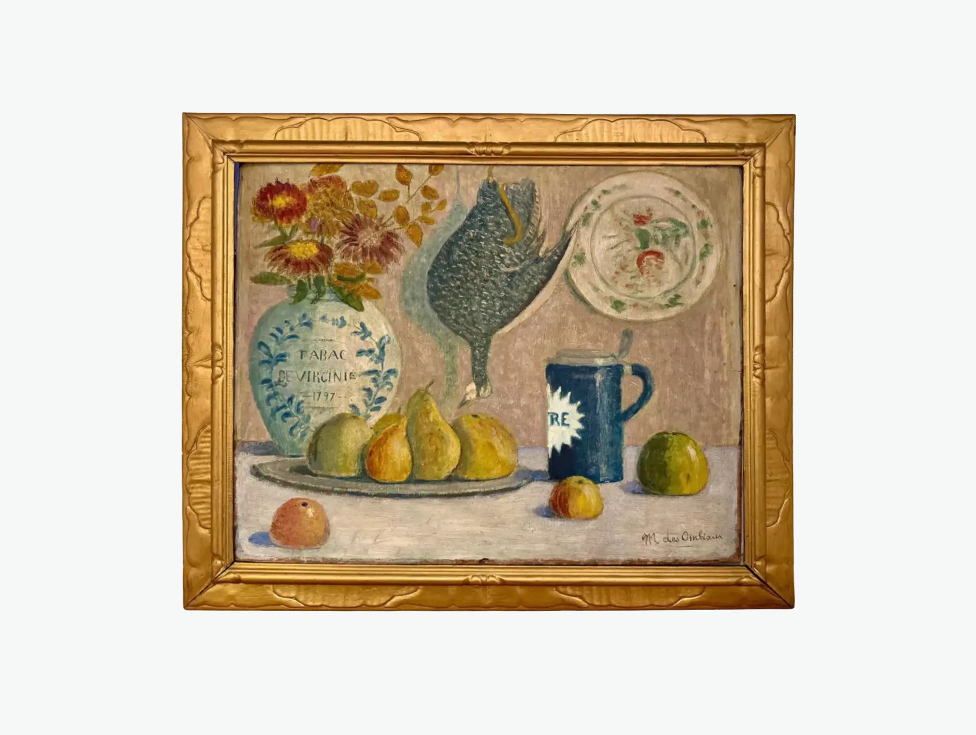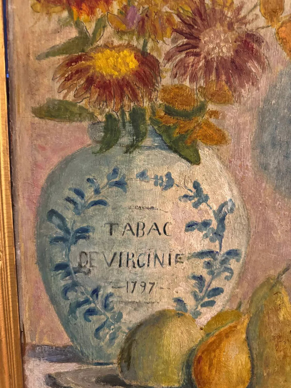 This antique still life has a rare quality: it feels alive, welcoming, almost like walking into a room where time has paused. Painted around 1900, the work depicts a table arranged with pears, a tobacco jar adorned with chrysanthemums, a ceramic plate, and a cobalt vessel. A pheasant, tied gently by the feet, rests quietly in the scene, recalling the tradition of hunting still lifes, yet here softened into something more poetic.