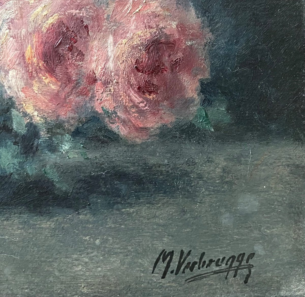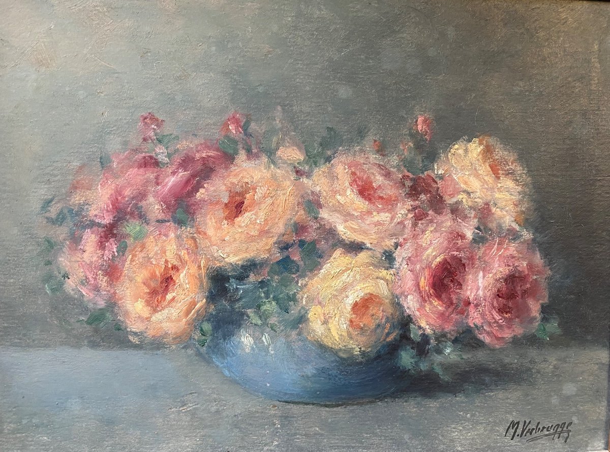 Early 20th Century French Oil Luminous Roses in Blue Vase