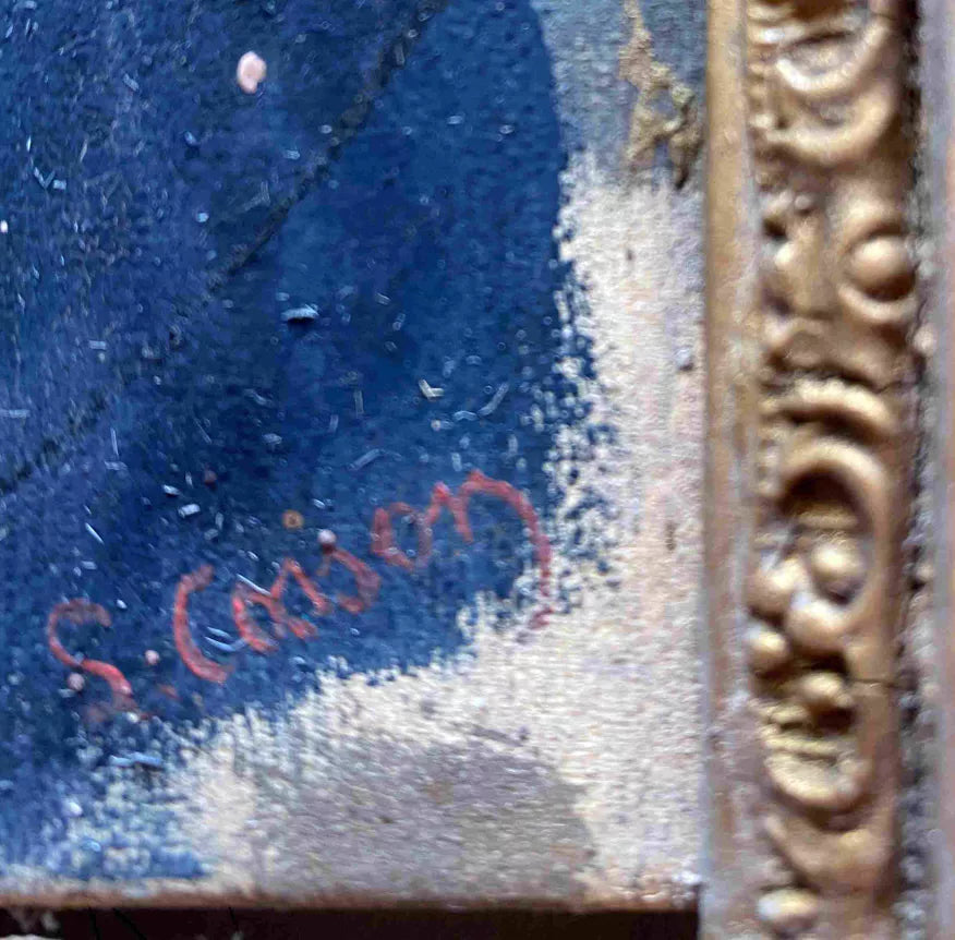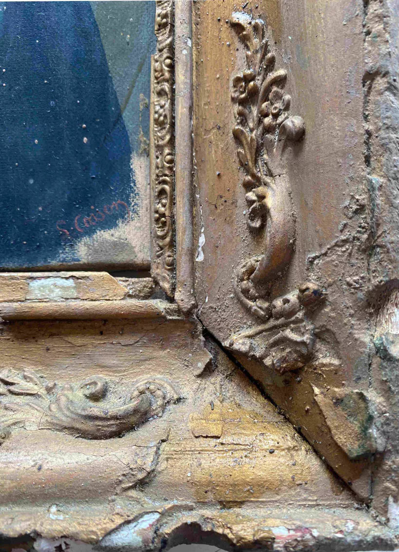 Discover the elegance of 19th-century French artistry with this captivating oil portrait titled "Man with Bow Tie," signed by S. Cosson. Discovered in an attic, this artwork is a testament to its historical journey and likely originally framed in an oval frame. This artwork, created in oil on embedded canvas, portrays a gentleman exuding kindness and grace.