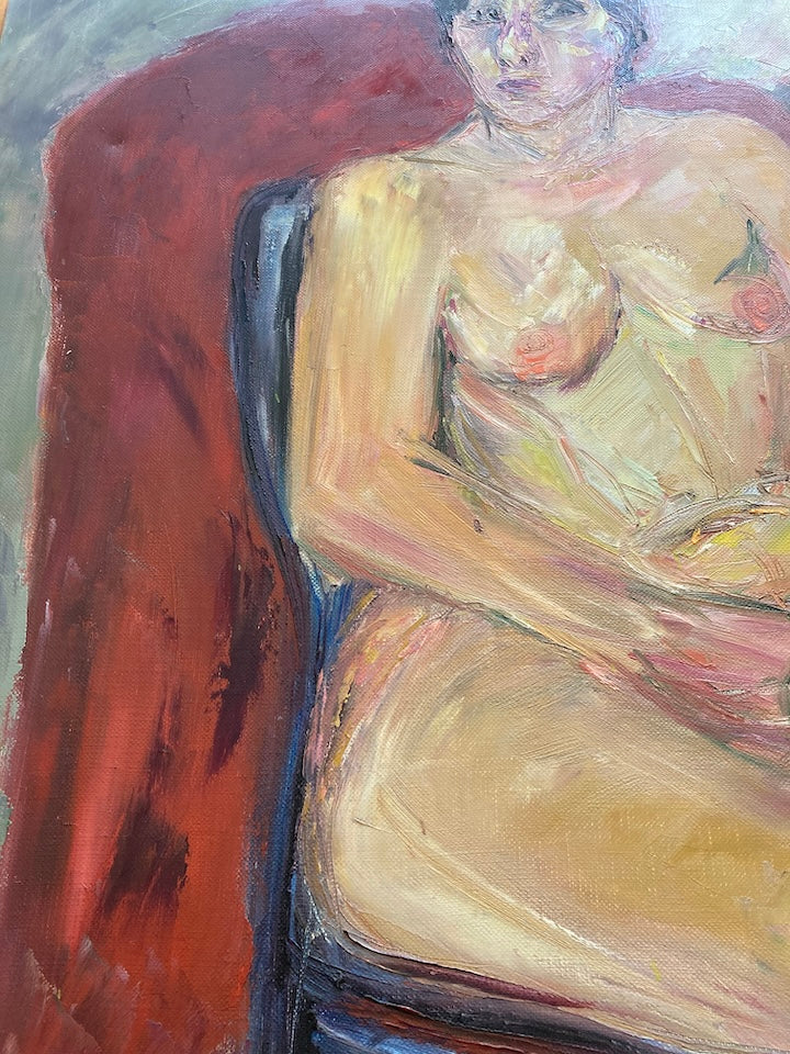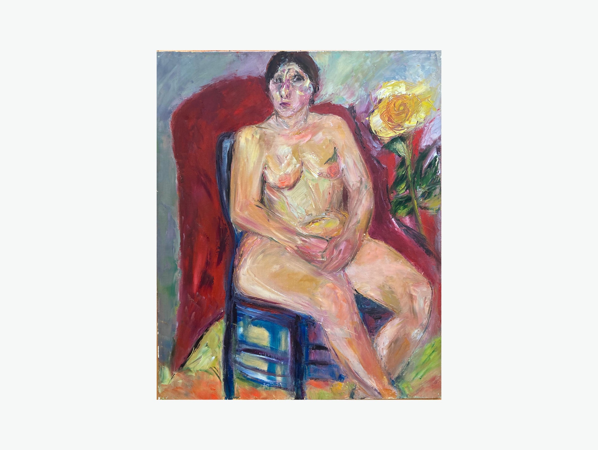 This vibrant oil painting from the studio of French artist Marie-Louise "Malou" Garnavault (1911-2012) showcases her distinctive approach to color and form. The female nude subject emerges through expressive brushstrokes and bold chromatic choices, reflecting influences from her encounters with Marc Chagall and training under noted painters Gabriel Coldefy and Edouard Jaguer.